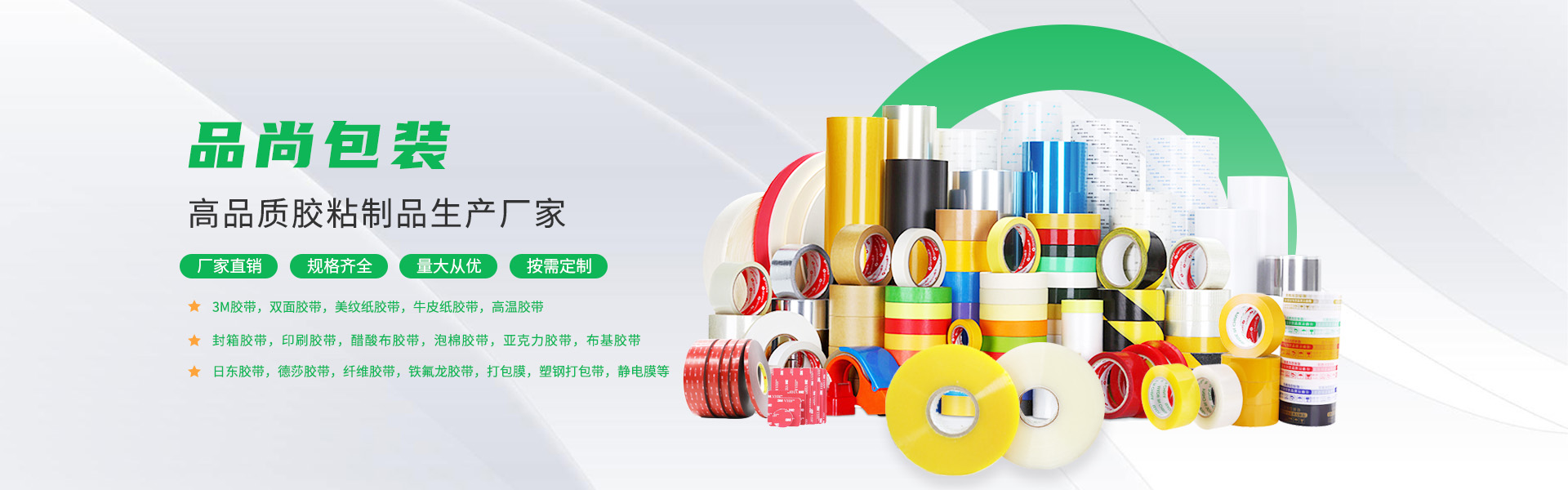 生產的產品主要有封箱膠、美紋膠、雙面膠、印刷膠、纖維膠、高溫膠、瑪拉膠、彩色膠、醋酸布、拉伸膜、保護膜、進口3M膠、德莎(TESA)、日本日東(NITTO)、索尼(SONY)等等,及各種特殊膠帶